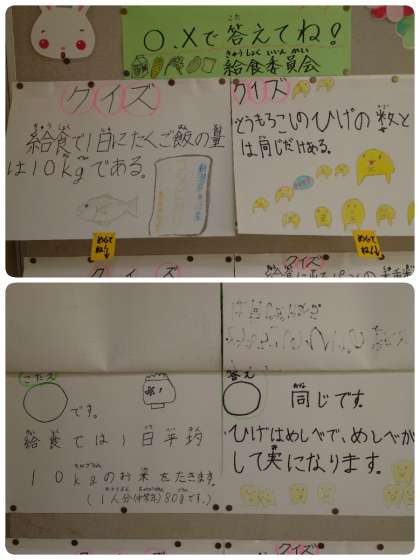 給食室前の掲示板に貼ってあるクイズは、給食委員会の子ども達が作りました。かわいいカットがたくさん描いてあります。