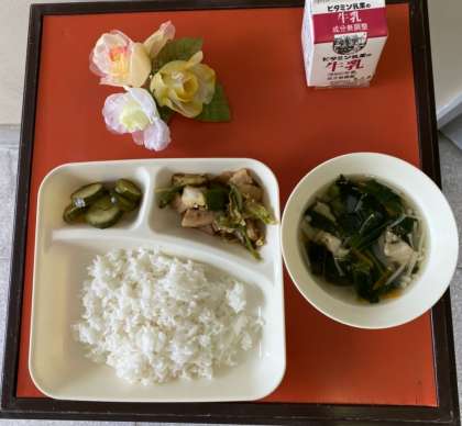 今日の給食は、ホイコウロー・中華スープ・きゅうりのピリ辛あえ・ご飯・牛乳でした。