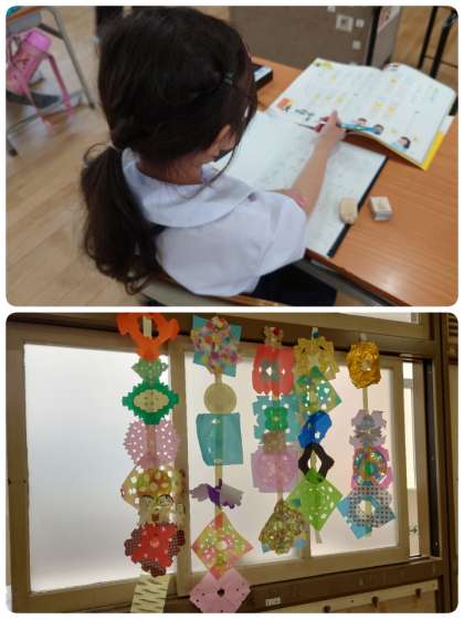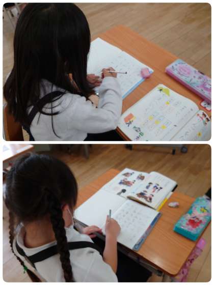 国語の時間、くっつきの「を」の使い方の学習をしていました。ノートをのぞいてみると、どの子もていねいな字で書くことができています。「お」と「を」の使い分けができるようにがんばっています。