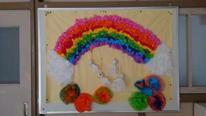 今日から6月。なかよし学級の掲示板がさっそく変わっていました。先日、なかよしタイムの時にみんなで協力して作成していた作品です。鮮やかなレインボーやアジサイ・テルテル坊主が、6月にぴったりですよ。