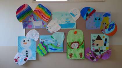 2年生の掲示板の作品は、「ふしぎなたまご」です。割れた卵の中から出てくるのは、黄身ではありません。中から出てきたのは、おいしそうな食べ物や好きなキャラクターや動物など、子ども達の想像の世界です。夢がいっぱいで、かわいい作品になっています。
