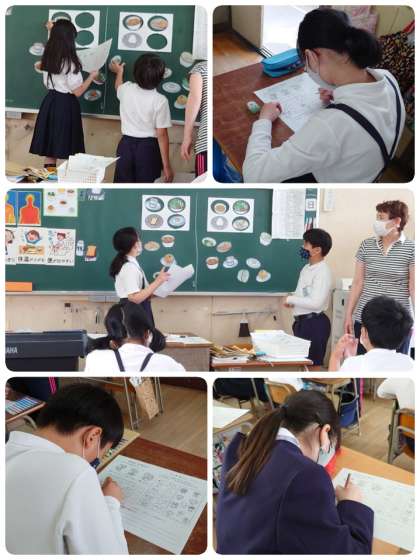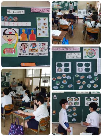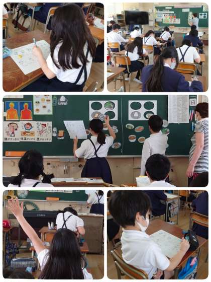 5年生が、「朝ごはんについて考えよう」の学習をしました。「1日のスタートは朝ごはんから」ということで、まず朝ごはんの役割について考えました。朝ごはんを食べると、頭がすっきりし、体温が上がり、便が出やすくなります。次に、赤・黄・緑の3つのグループがそろった朝ごはん(主食がごはんとパン)を考えました。できた献立を発表し、みんなで3つのグループが入っているか確認しました。昨年度の校内アンケートでは、九条東小学校の89%の子どもが朝食をほぼ毎日食べてきています。11%は食べていないことが多いと答えています。成長期の子ども達です。全員が、毎日朝ごはんを食べる習慣をつけてほしいです。保護者のみなさん、ご協力よろしくお願いします。