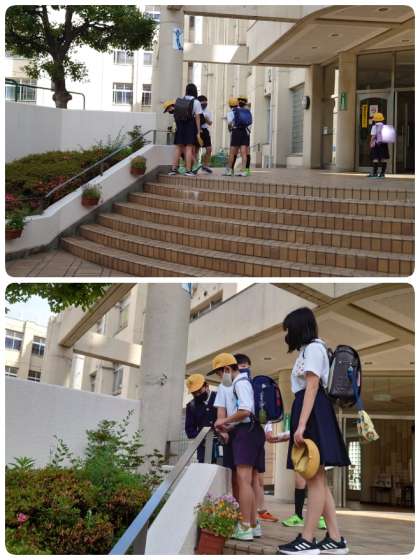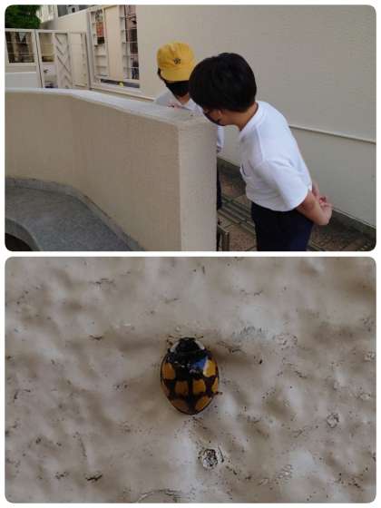 1番早く登校してきた子ども達が、ランドセルを置いてさっそくダンゴムシ探しに夢中です。今日はなぜかダンゴムシがたくさん集まっていました。しばらくすると今度は「校長先生、テントウムシがいました。」と呼んでくれました。見に行くと小さなテントウムシが1匹。いろいろなことに興味をもっている子ども達です。その後から登校してきた子ども達に「こっち来て!」と声をかけ、みんなでダンゴムシをながめていました。