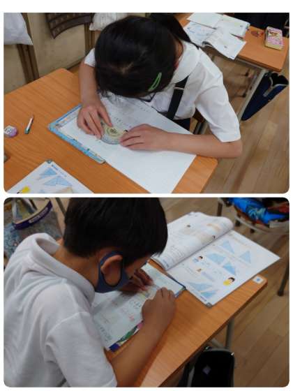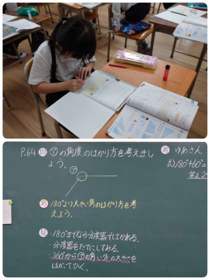 算数の学習で、180°より大きい角の測り方を考えていました。180°までは、分度器で測ることができます。どんな考え方をしたらよいのでしょう。子ども達が測ろうとしている角は90°より大きいか小さいかで、数字の読み取りが変わってきます。測った後は360°からひき算をして答えを求めていました。早く解けた子どもがミニ先生になって活躍していましたよ。