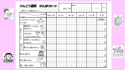 ・今週は、健康週間です。健康週間カードには、せいけつ・感染予防・生活のリズムについての内容を載せています。カードにチェックをして自分の生活をふりかえってみましょう。