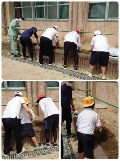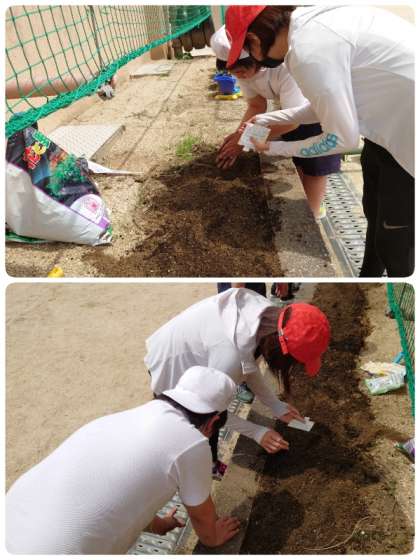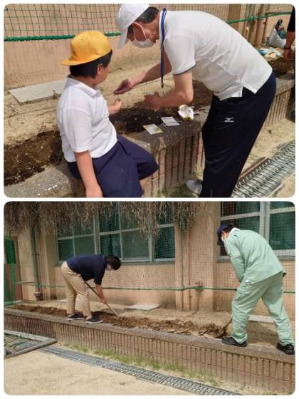 昨日、地域の方からヒマワリの種をたくさんいただきました。「お花の力で日本を元気に!!希望の種をまこう!」というプロジェクトに応募したそうです。さっそくなかよし学級の子ども達と先生が講堂横の花壇の土を耕して、ヒマワリの種をまきました。管理作業員さんと教務主任の先生も一緒にお手伝い。これからお世話もがんばります。