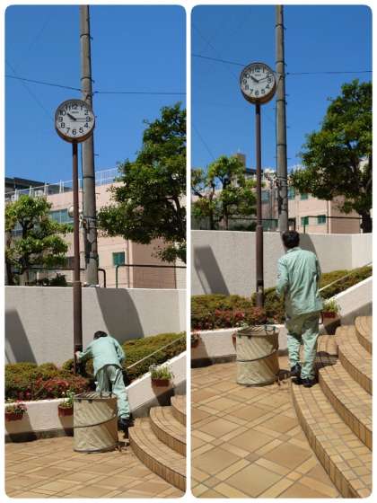正門前の時計が少し遅れているのでずっと気になっていました。時計の針の直し方がわからないのでいろいろ調べてみたら、支柱の中に調整する機械があることが分かりました。さっそく管理作業員さんに直してもらいました。すっきりしました。
