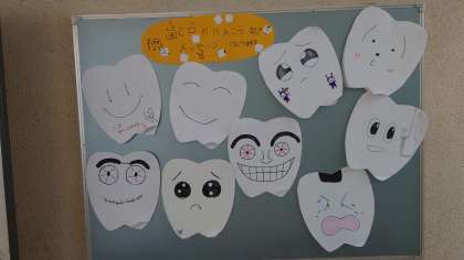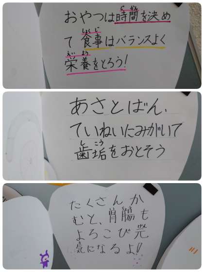 健康委員会の子ども達が、「歯と口の健康メッセージ」を作りました。玄関の掲示板に貼ってあります。カードをめくると子ども達のメッセージが書いてあります。