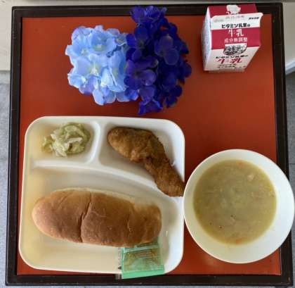 今日の給食は、サーモンフライ・豆乳スープ・キャベツのソテー・コッペパン・りんごジャム・牛乳でした。