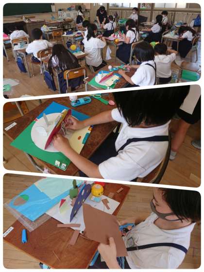 今日の5時間目、3年生が図工科で「くるくるランド」を作っていました。