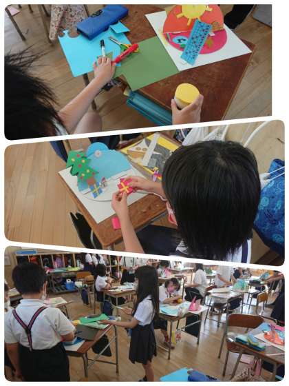 これまで5時間程度取り組んでいて、今日で完成させるとのことだったので、仕上げに色画用紙や色ペンを上手に使いながら、イメージを形作っていました。