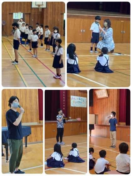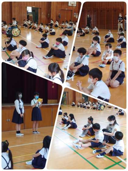 今日の児童朝会では、まず今日から九条東小学校の仲間になった1年生を紹介しました。自分で名前をしっかり言って「よろしくお願いします。」と上手にあいさつもできました。全校のみんなからあたたかい拍手をもらいました。