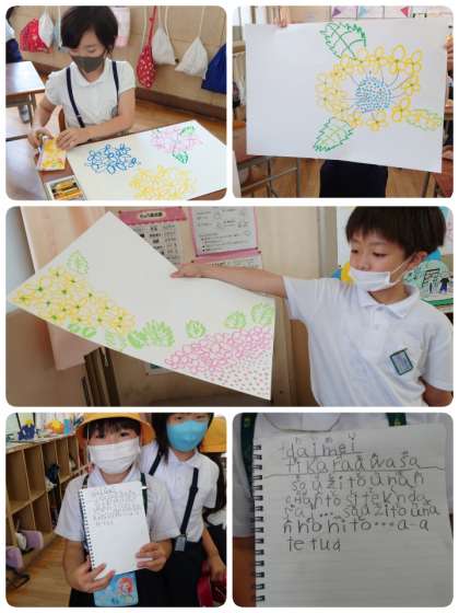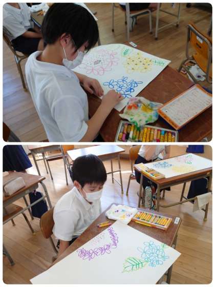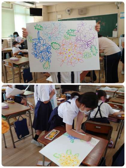 昨日3年生の教室に入ると、色鮮やかなアジサイの絵を子ども達が描いていました。子ども達が次々と自分が描いた絵を「見て見てっ!!」と持ってきてくれました。どの絵も一つ一つの形をていねいに描いてあります。中には、ローマ字で書いたノートを見せにくる子もいましたよ。みんな「ほめてほめてっ!!」の顔をしていました。