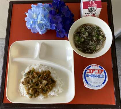 今日の給食は、和風カレー丼・もずくとオクラのとろり汁・ヨーグルト・牛乳でした。