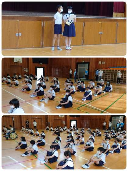 *代表委員から、水曜日に実施する「校内クリーンアップ作戦(たてわり清掃)」のめあてについてお知らせがありました。めあては、「みんなでなかよく学校をきれいにしよう!」です。代表委員の2人は、はきはきとお話することができました。
