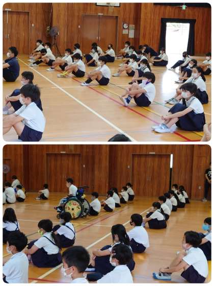 明日からみなさんが楽しみにしている水泳学習が始まります。明日は、1〜4年生、明後日の水曜日が5・6年生のプール開きです。去年は、コロナの感染予防のため、高学年しか水泳学習ができなかったので、1・2年生は初めて、3・4・5年生は2年ぶりの水泳学習です。水泳学習をするにあたって、守ってほしいことがあります。水泳中や終わってからの着替えでは、マスクを外しています。ですから、お友達との間隔をしっかりあけます。みんな、両手を指先まで真横にまっすぐ伸ばしてみましょう。マスクを外しているときは、その指先がお友達と当たらないぐらいの間隔をしっかりとりましょう。