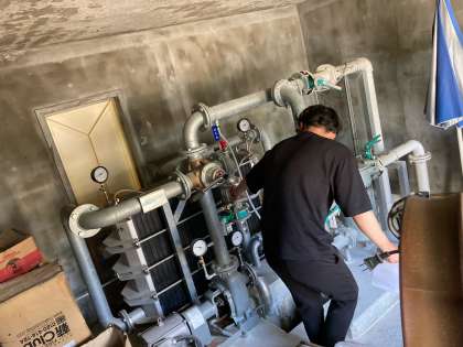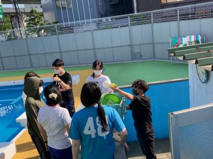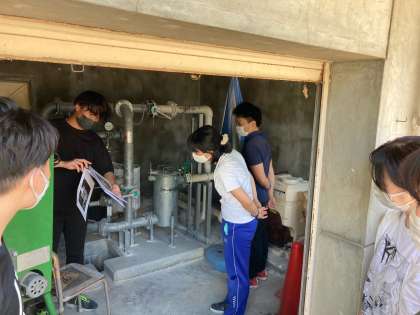 明日から水泳学習が始まります。教職員が、ろ過装置の使い方について研修を受けています。ろ過装置はプールの水をきれいに保つための機械です。毎日、朝と夕方に機械を操作しています。