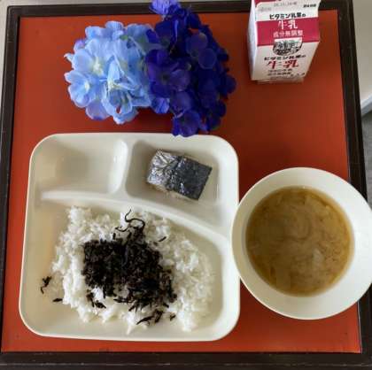 今日の給食は、さごしの塩焼き・みそ汁・牛ひじきそぼろ・ごはん・牛乳でした。
