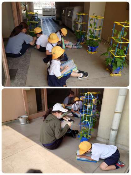 1年生が、アサガオの観察記録をかいていました。講堂と給食室の間の廊下は学校中でいちばん風がよく通る場所です。葉っぱをさわって「チクチクしてる」、ツルの様子を観察して「先がくるんてなってる」など、発見したことをつぶやきながら熱心にかいていましたよ。
