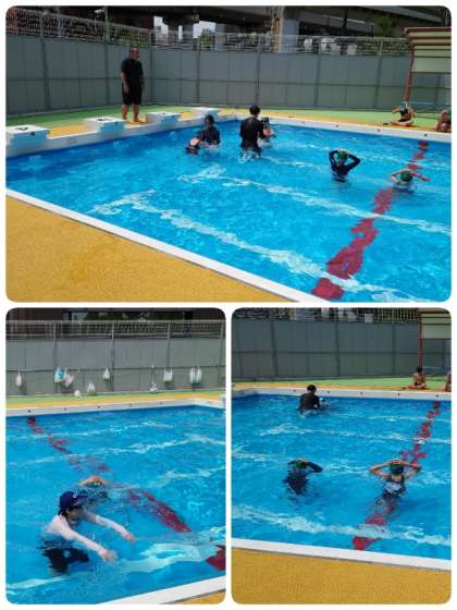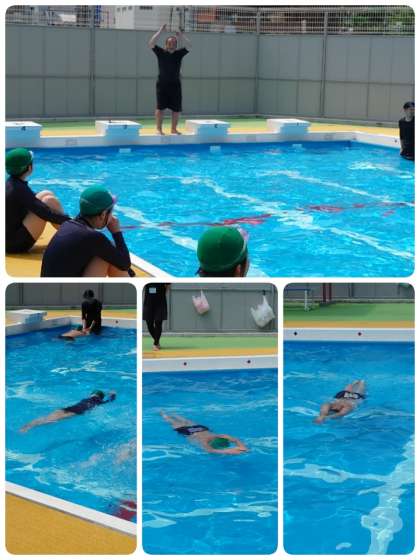 今日の5年の水泳学習は、教頭先生が全体の指導をしていました。息継ぎが上手にできるように順を追って練習していました。子ども達は、教頭先生の話をよく聞いて熱心に練習していました。
