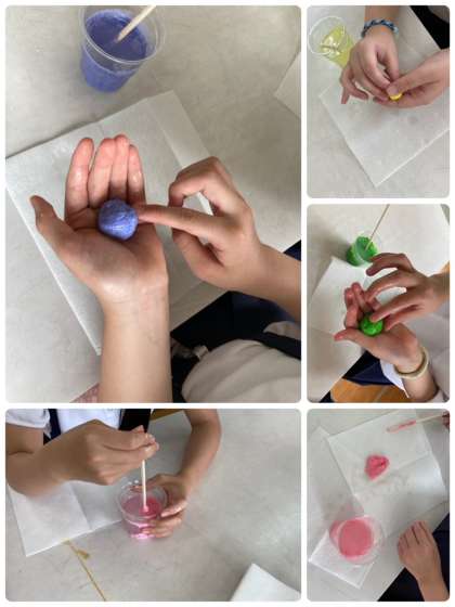 科学クラブでは、スーパーボールを作りました。洗濯のりに絵の具を混ぜて、食塩水を入れ、少し待ちます。しばらくすると白いものができてくるので、割りばしでゆっくりかき混ぜるとかたまりになります。水から取り出して、形を整えながら水分を取っていきます。すると、スーパーボールのできあがりです。1日乾燥させるとよくはねます。