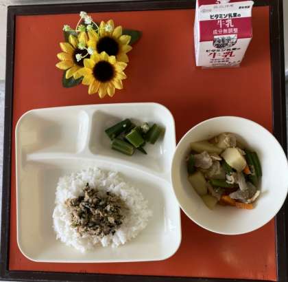 今日の給食は、豚肉とじゃがいもの煮物・オクラの梅風味。ツナっ葉炒め、牛乳でした。