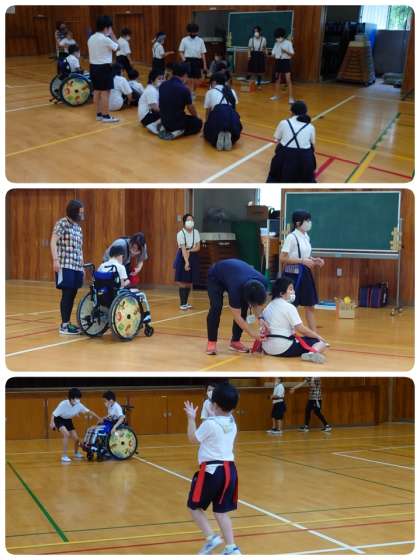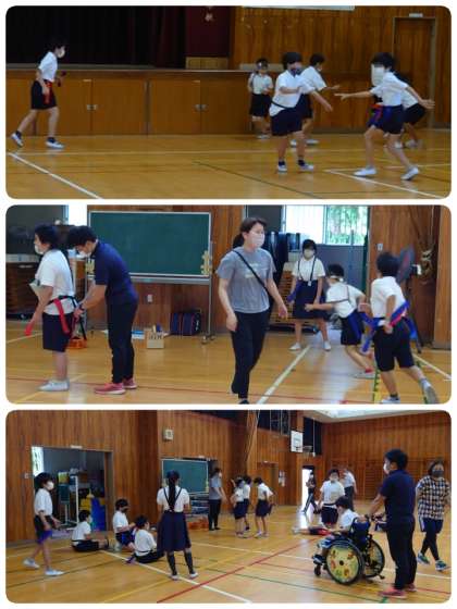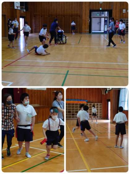 1時間目になかよしタイムの公開をしました。今日は、「東っこオリンピックをしよう〜ボッチャ〜」でした。6年生がリーダーとして準備運動をしたりゲームを進めたりするときに活躍しました。今日したゲームは、まずしっぽとり。講堂の中を元気いっぱい走り回りました。
