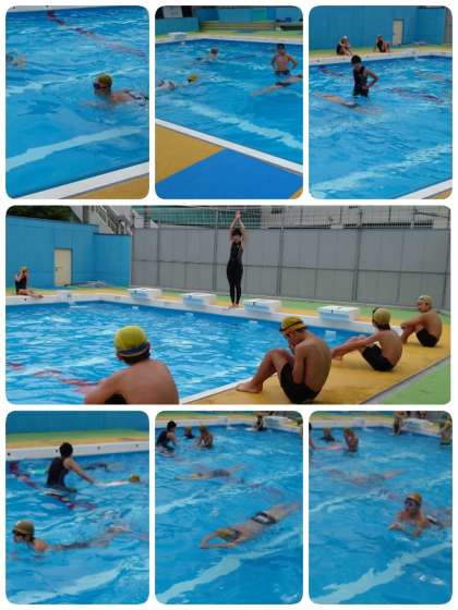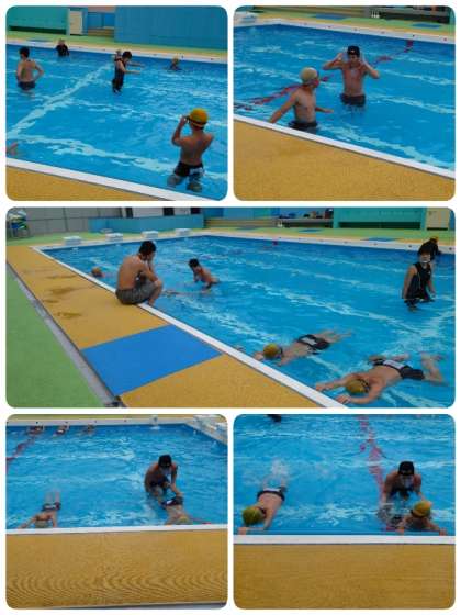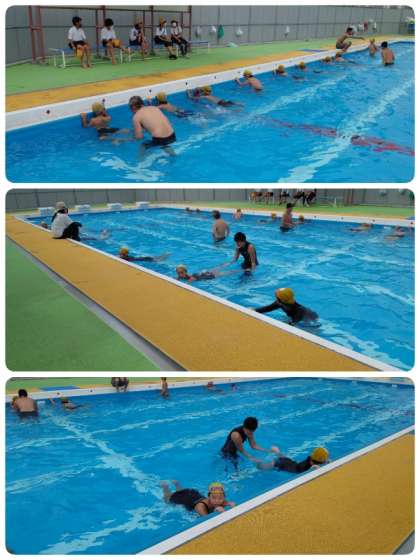 今日は、西区水泳インストラクター派遣事業で2人の先生に来ていただき、水泳の指導をしていただきました。6年生は、平泳ぎを教えてもらいました。足の蹴りや手のかき方、手と足のタイミングなどひとつひとつていねいにアドバイスをしてもらい、何回もがんばって練習しました。「平泳ぎの足の蹴るタイミングがよく分かった。」と自己評価している子どももいました。上達が実感でき、意欲がますます増したようです。