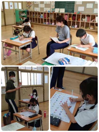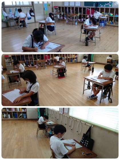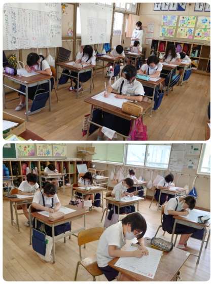 テストの注意点が校内放送で流れると、みんな真剣な表情をしていました。始めの放送の後は、教室はシ〜ンと静まり返り、鉛筆を走らせる音だけが聞こえてきました。子ども達もよい緊張感で学期末漢字テストに臨んでいました。この姿勢がすばらしい。またまた花丸ですね。