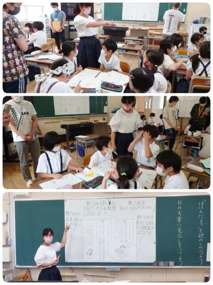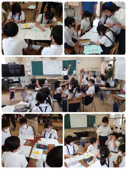 3−1の子ども達は、やる気にあふれていました。たくさんの先生達が授業を見に来るので張り切っていました。自分の考えをまとめ見出しを書き、友達に理由を説明できるように整理していきました。少人数での話し合い活動も活発で、のびのびと自分の考えを発表していました。他のグループが考えたことについては、なるほどと感心したり、思わず拍手があがったりしていました。とても充実した1時間でした。