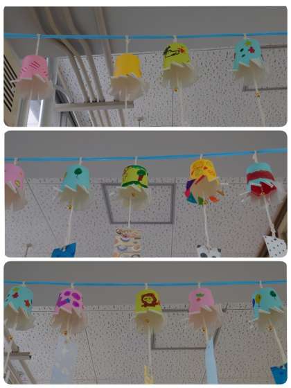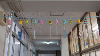2年生の教室前廊下に子ども達が作った「ふうりん」が飾ってあります。廊下を歩くたびに、かわいいふうりんが揺れています。