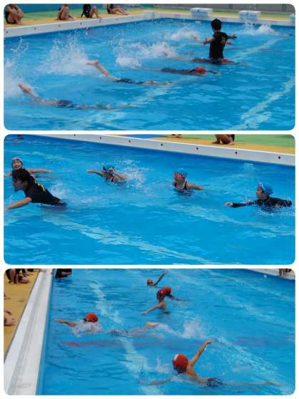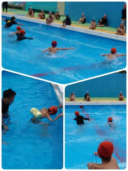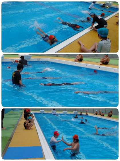 3・4年生は、音楽に合わせた楽しい準備運動で、しっかり水慣れをしました。とても楽しそうに体を動かしていました。その後、ふしうき・けのび・バタ足・クロールと、どんどん泳いでいきます。水泳学習を始めたころに比べると、みんなとても上達しています。!(^^)!