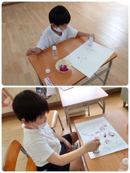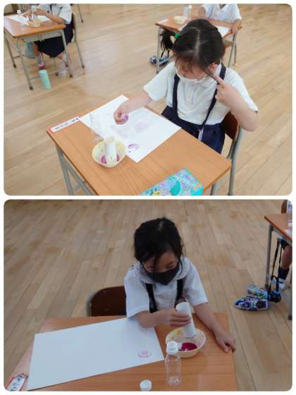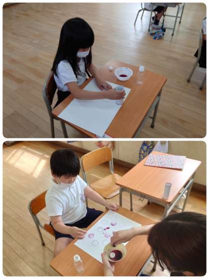 1年生は、自分で育てたアサガオの花の色水あそびをしていました。とてもきれいで鮮やかな色水がとれたので、子ども達もワクワクしていました。画用紙にいろいろな形のものを使ってペタンペタン。とても楽しんで活動していましたよ。