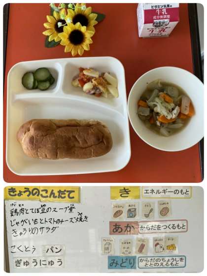 今日の給食は、鶏肉とてぼ豆のスープ煮・じゃがいもとトマトのチーズ焼き・きゅうりのサラダ・黒糖パン・牛乳でした。