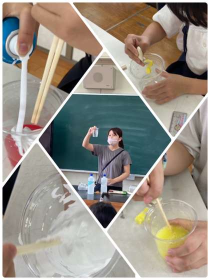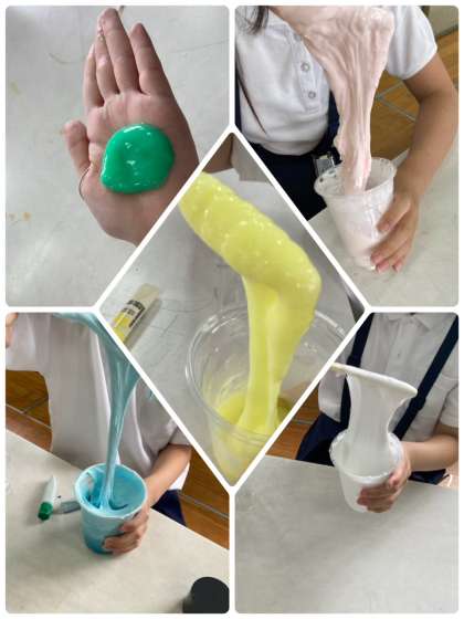 月曜日のクラブ活動で、科学クラブの子ども達がスライムを作っていました。洗濯のりに水、絵の具、ホウ砂の水溶液を混ぜるとスライムを作ることができます。さらに今回は、シェービングフォームを混ぜました。すると、スライムがとてもふわふわになり、ながーく伸ばしてもなかなかちぎれません。シェービングフォームの量を調整して自分だけのスライムを楽しそうに作っていました。