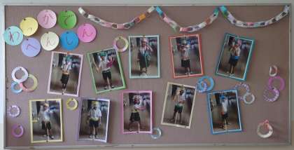 2年の掲示板に、子ども達が「わっかで へんしん」した写真が貼ってあります。強そうなポーズをしていて、とってもかっこいいですよ。