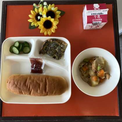今日の給食は、もずく入りヒラヤーチー・豚肉と厚揚げの煮物・あっさりキュウリ・コッペパン・牛乳でした。