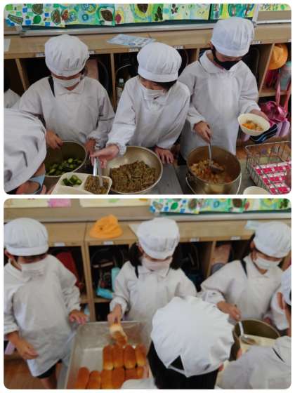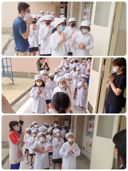1学期の給食も今日と月曜日のみとなりました。給食室の前で、みんなで「いただきます!」のあいさつをして、食缶などを調理員さんに手渡してもらいます。給食当番は、食器に短時間で盛り付けていきます。いつもモリモリ食べてくれる子ども達です。