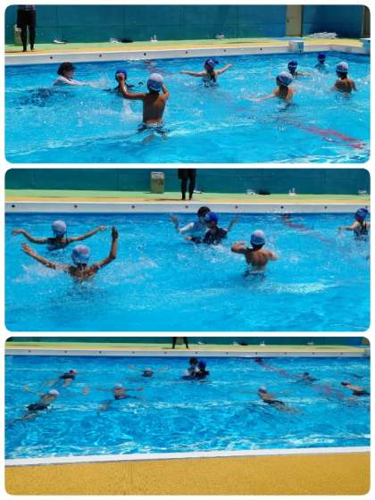 もうすっかり水に慣れて、とても楽しそうに水あそびをしていました。先生の指示をよく見て、潜ったり浮いたり・・・。プールの床に手やお尻でタッチできるようになりました。子ども達は、水あそびの学習を思う存分楽しんでいました。笑顔があふれていましたよ。