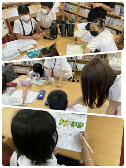 図書室では、先生と学習サポーターさん数名で、夏休みの宿題や自由課題に一緒に取り組みました。本活動は、7月末までの平日の午前10〜11時まで実施していますので、もしご家庭でお子さんが時間を持て余しているようでしたら、参加するよう声かけをお願いします。