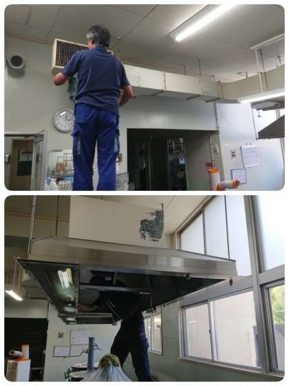 今日は昼前から、給食室の調理場内に設置されている換気用ダクトの清掃を業者に行ってもらっています。