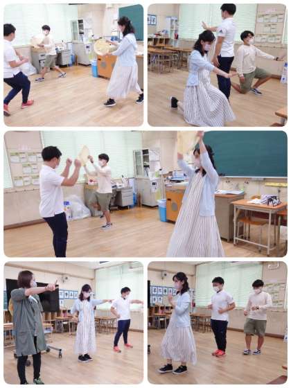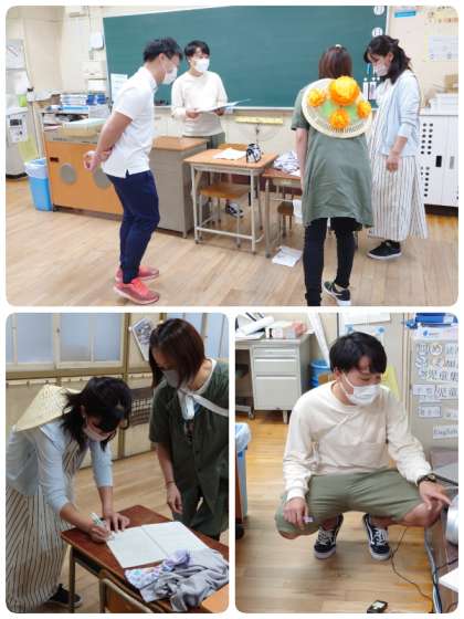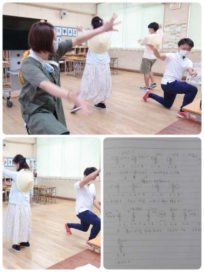 3・4年の先生達が集まって、運動会の団体演技の踊りや隊形等について相談をしていました。曲をかけてカウントを取りながら振り付けがどんどん決まっていきます。このくらいのカウントで移動が終わって、次の動きが始まるまではどうする?かっこよく決めるにはどんなポーズがいいのかな?と、次々アイデアが湧き出てきます。先生達はずっと踊りっぱなしで、ずっと笑顔。踊っているうちに、もっとこうしたらいいんじゃないかなと意見が出て、見る見るうちにパワーアップした踊りに変わっていきました。きっと子ども達もすごく気に入ると思います。