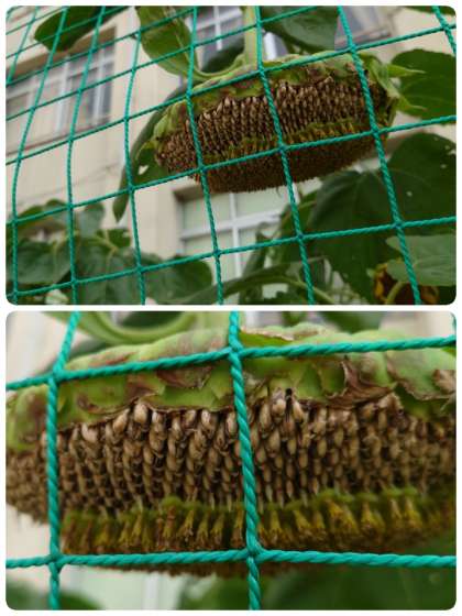 ヒマワリの花が枯れた後、タネが順調に育ってきました。今はちょうど外側からタネができ始め、内側はまだ花弁が残っている段階です。2学期に入ってもっとタネが熟したら、子ども達に数えてもらおうと思います。
