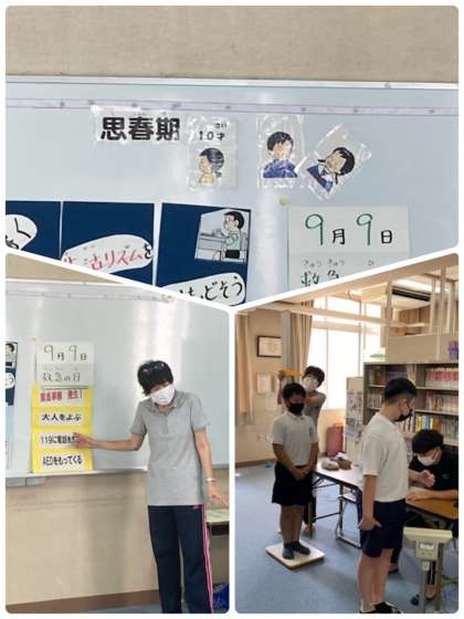 9月9日は、「救急の日」です。人が倒れている場面にもし自分が遭遇したら、どのように行動すればいいのでしょうか。まずは、近くの大人を呼びましょう。119番通報やAEDを持ってくることも大切です。九条東小学校では、なかよし教室の近くにAEDが設置してあります。