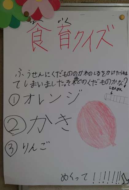 給食室前の掲示板に、「食育クイズ」が貼ってあります。問題は全部で6問。