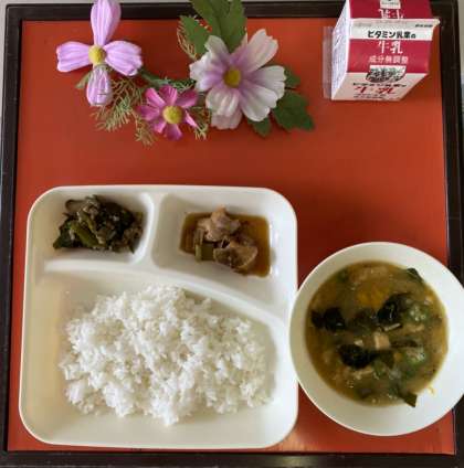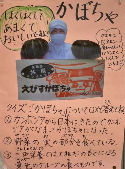 今日のみそ汁に使われているかぼちゃですが、カロテンやビタミン、食物繊維をバランスよく含んでいる野菜です。給食では他に、スープや焼きかぼちゃ、小豆と一緒に似たいとこ煮等で提供されます。