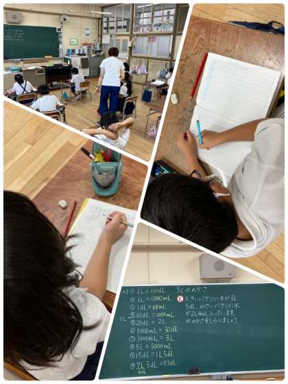 2年生では、水のかさを表す単位として「L」「dL」「mL」を学習しています。今日は、たし算とひき算の仕方について考えました。単位を合わせて計算をすると答えを見t引き出せることに気づきました。