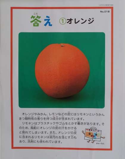 オレンジやみかん、レモンなどの皮(かわ)にはリモネンというかんきつ類(るい)特有(とくゆう)の香(かお)りを持(も)つ成分(せいぶん)が含(ふく)まれています。リモネンはプラスチックやゴムをとかす働(はたら)きがあります。そのため、風船(ふうせん)にオレンジの皮(かわ)の汁(しる)をかけると割(わ)れてしまいます。また、オレンジの皮(かわ)に含(ふく)まれるリモネンは油汚(あぶらよご)れを落(お)とす力(ちから)もあり、洗剤(せんざい)にも使(つか)われています。