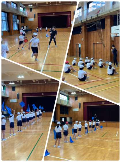 運動会で使うフラッグで体つくり運動を行いました。体育館の縦いっぱいに広がって、合図に合わせて旗を上げたり下げたりします。出席番号が偶数の子どもは右手、奇数の子どもは左手で旗を上げており、タイミングが揃うととても綺麗でした。