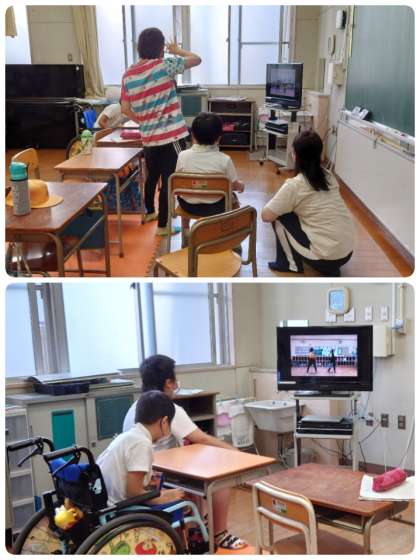 運動会の団体演技の練習に向け、なかよし学級の子ども達が、ダンスのビデオを見ていました。事前に先生達が踊っているところを撮影したビデオです。担任の先生達が踊っているのを見て、ニコニコしながら見ていました。見終わってからすぐに体を動かしていましたよ。